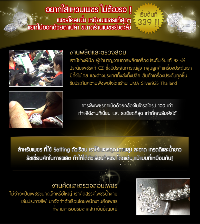 ยินดีต้อนรับเข้าสู่ umasilver925.com เรามีความเชื่อเหลือเกินว่า เมื่อคุณได้เข้ามาในเว็บไซต์ umasilver925.com แล้วจุดมุ่งหมายของคุณคงอยากเข้ามาเยี่ยมชมเครื่องประดับที่ทางร้านมีการจัดจำหน่ายกันอยู่แล้ว ดังนั้นก่อนที่จะเข้าไปเลือกชมสิ่งที่น่าสนใจจากทางร้าน เรามาลองดูกันก่อนดีกว่าว่าทาง เว็บไซต์ของเรามีอะไรให้ทางชม และท่านสามารถหาอะไรได้จากในนี้ UMA Silver925 Thailand เป็นร้านที่ จัดจำหน่ายเครื่องประดับที่มีคุณภาพในระดับดีเยี่ยมไม่แพ้ร้านใดในประเทศไทย โดยทางเรามีการจัด จำหน่ายทั้งในราคาส่งและปลีกย่อย โดยท่านสามารถพบเจอสินค้าในรูปแบบของเงินแท้ 92.5% ประดับ เพชรแท้ CZ หรือเพชรคุณภาพชั้นดีชนิดอื่นที่ทางเราทั้งคัดเลือกมาแล้วเป็นอย่างดี ภายในเว็บไซต์จะแยก ประเภทสินค้าออกมาตามจุดประสงค์การใช้งาน ทั้งภาพรวมใหญ่แบบเครื่องประดับเงินแท้ 92.5% แหวน ต่างหู กำไล ต่างหูพร้อมจี้ สร้อยคอ จี้และสร้อยข้อมือ ซึ่งภายในหมวดหมู่แต่ละชนิดก็จะมีสินค้าอยู่มากมาย ทั้งการที่นำเงินไปผสมกับทองคำ ใส่เพชรเติมลงไปให้สวยงาม ที่สำคัญสินค้าจากทางร้านขายจำนวนจำกัด เรียกว่าหมดแล้วหมดเลยไม่มีทางทำซ้ำอย่างเด็ดขาด ดังนั้นคุณมั่นใจได้เลยว่าหากซื้อสินค้าจากทางร้าน เราไปแล้ว อย่างน้อยก็หาใครที่ซื้อเหมือนกันยากแน่นอน ซึ่งหากใครเห็นแค่รูปภาพแล้วยังตัดสินใจไม่ได้ แล้วละก็ ทุกสินค้าของทางร้านก็มีรายละเอียดไว้บอกให้คุณได้ใช้ตัดสินใจอย่างถี่ถ้วนอย่างแน่นอน ทั้งราย ละเอียดที่เราต้องการทราบพื้นฐานอย่างขนาด น้ำหนัก องค์ประกอบโดยรวมของเครื่องประดับ การทำความ สะอาด อายุการใช้งาน จนไปถึงการระบุราคาและส่วนลดไว้อย่างชัดเจนแล้ว ดังนั้นคุณจะสบายใจได้เลยว่า เมื่อซื้อสินค้าจากทางเว็บไซต์ของเราไปจะได้รับสินค้าคุณภาพ ถูกต้องตามภาพ และไม่มีการบวกราคาเพิ่ม ขึ้นแต่อย่างใด มีแต่จะลดลงหากคุณเลือกซื้อเยอะขึ้นไปอีกด้วยนั่นเอง ไม่เพียงเท่านั้นทางเว็บไซต์ก็ไม่ได้ เจาะจงจะขายสินค้าอย่างเดียว ยังคงมีบทความคุณภาพมากมายให้คุณอ่านเพลินๆ โดยบทความจะเน้น ความรู้จากเครื่องประดับ ทั้งวิธีการเลือกสวมใส่ หรือวัสดุที่มีศัพท์เฉพาะทางมากๆคืออะไรทางเว็บเค้าก็ใส่ใจ และเขียนให้คุณได้รับชมทั้งหมดแล้ว นอกเหนือไปจากเรื่องราวที่ได้กล่าวมาทางเว็บไซต์ umasilver925.com ยังมีการแจ้งชำระสินค้าที่เข้าใจได้ง่ายไม่ว่าใครก็ทำตามได้ หรือหากมีปัญหาเกิดขึ้น จากกระบวนการ เกิดข้อสงสัยก่อนสั่งซื้อ อยากขอเป็นตัวแทนจัดจำหน่าย ทางร้านก็มีเว็บบอร์ดรวมถึงช่อง ทางการติดต่อมากมายให้